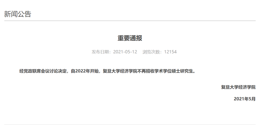 5月12日,复旦大学经济学院官网发布了一则《重要通报》: