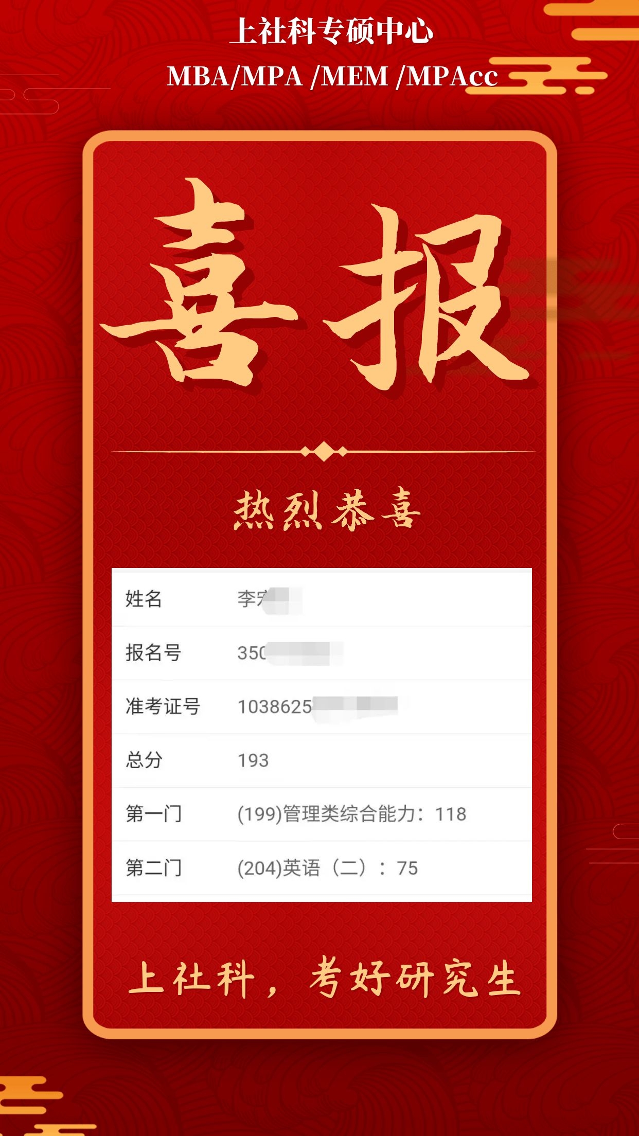 “星光不负赶路人,天道酬勤佳音来”,经历了漫长的不安与等待,这几天各大院校初试成绩也在相继公布,大家纷纷取得优异的成绩,上社科在此表示热烈的祝贺! 不论成功或失败,考研都是一场不懈的拼搏。不论是旗开得胜还是遗憾败北,在考研的路上,请继续奋斗,上社科专硕与您一路相伴。